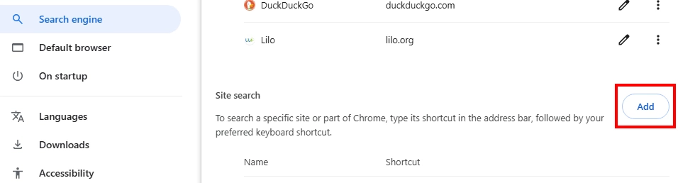 Go to the three dots menu (top right) > Settings > Search Engine > Site Search > Add